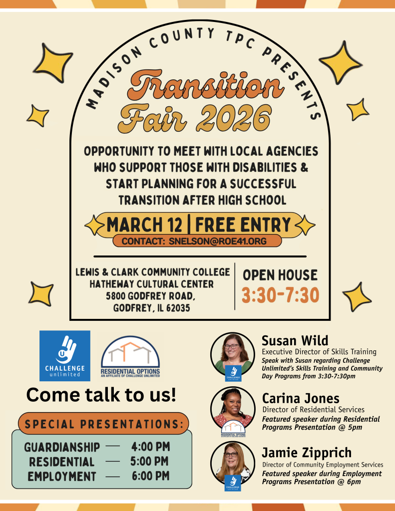 Challenge Unlimited, Inc. and its affiliate Residential Options are looking forward to connecting with families and students at Madison County TPC’s Transition Fair 2026. The open house with special presentations is an opportunity to meet with local agencies who support those with disabilities and can assist in the planning for a successful transition after high school. Attendees will have the chance to speak one-on-one with Susan Wild, Challenge Unlimited’s Executive Director of Skills Training, Jamie Zipprich, Director of Community Employment Services, and Residential Options’ Carina Jones, LCSW, Director of Residential Services. They will be in attendance answering questions and providing information about their programs and services. Carina Jones will be speaking during the Residential special presentation at 5:00pm and Jamie Zipprich will be speaking during the Employment special presentation at 6:00pm.