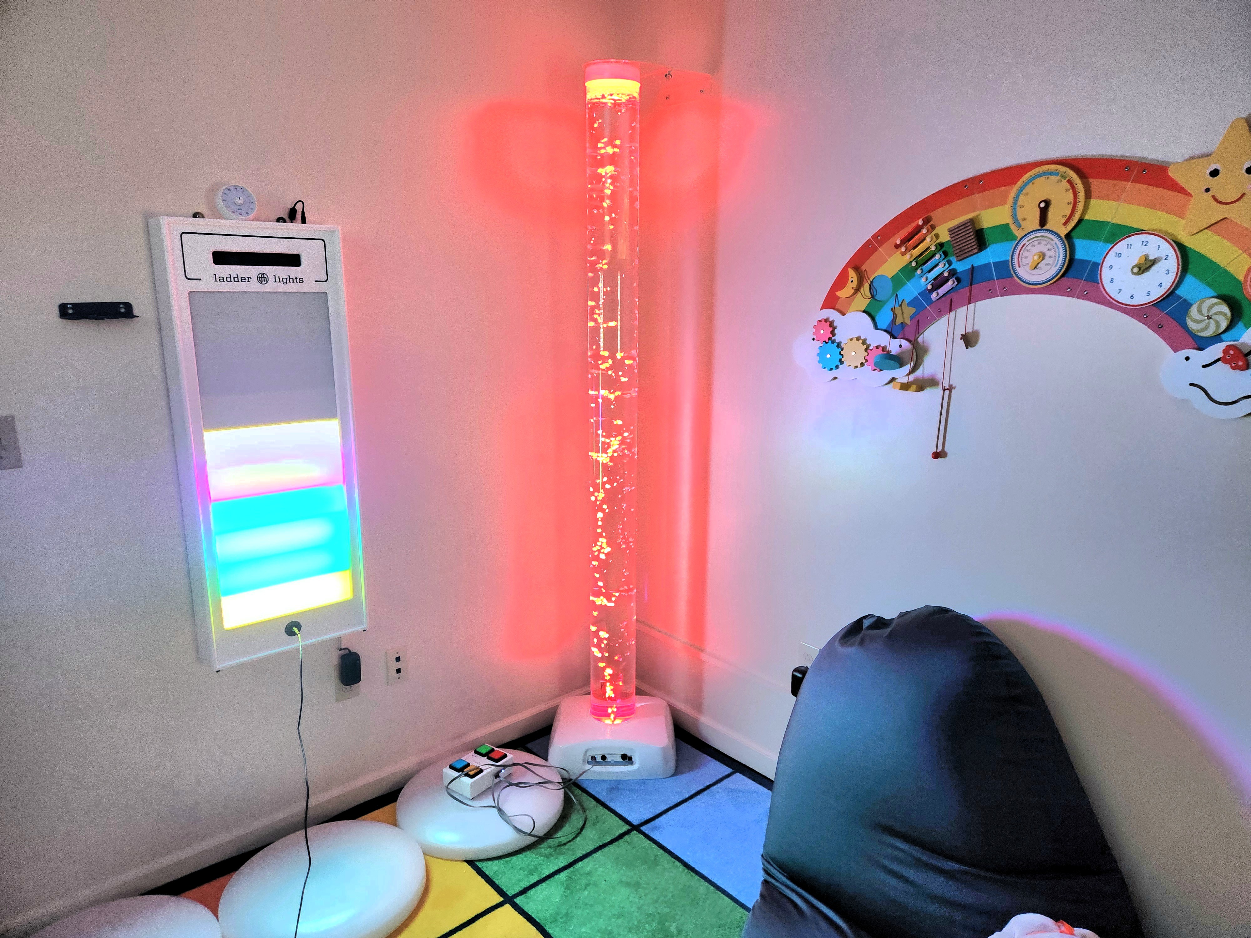 Each item in the sensory room serves a unique purpose to create a calming and engaging environment. The bean bag chair and rocking chair provide comfortable seating options that promote relaxation, reading, and refocusing. The bubble tube offers soothing visual and auditory effects that calm the mind and body, while the 4-button wireless color controller lets users personalize the bubble tube’s colors for an interactive experience. The rod wall panel encourages motor skill development, balance, and visual coordination through hands-on activity. Finally, the living scenery projector bundle enhances the environment with calming images and music, creating a peaceful, immersive atmosphere. Together, these items foster a safe, therapeutic space for sensory engagement and emotional regulation.